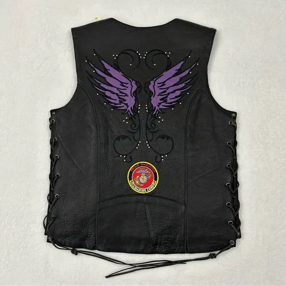 Milwaukee Leather Stud and Wings Black Motorcycle Biker Vest US Marine Womens S. Preowned in great used condition, has minor pin hole marking from pin on the front chest (pictured) also has custom US Marine Proud Daughter Patch sewn onto the lower back of the vest. Still a really nice high end leather vest. Made by Milwaukee Leather. Women’s size small. Retails 120$ plus Please see all pictures for details