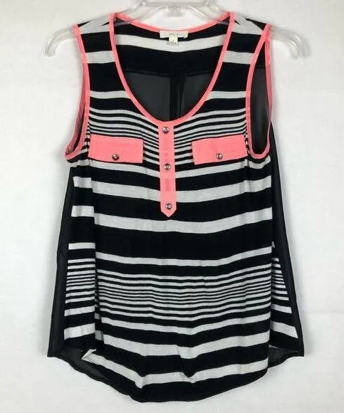 Women's striped tank top in black, white & pink. Scoop neck. Button accents. Faux chest pockets. Mesh fabric in back. Moderate wear. No stains, tears or holes. Rayon. Polyester. Dry clean. Approx. measurements: pit to pit 17" length 23", 24.5" Y2K retro throwback dainty lightweight career workwear minimalist feminine romantic
