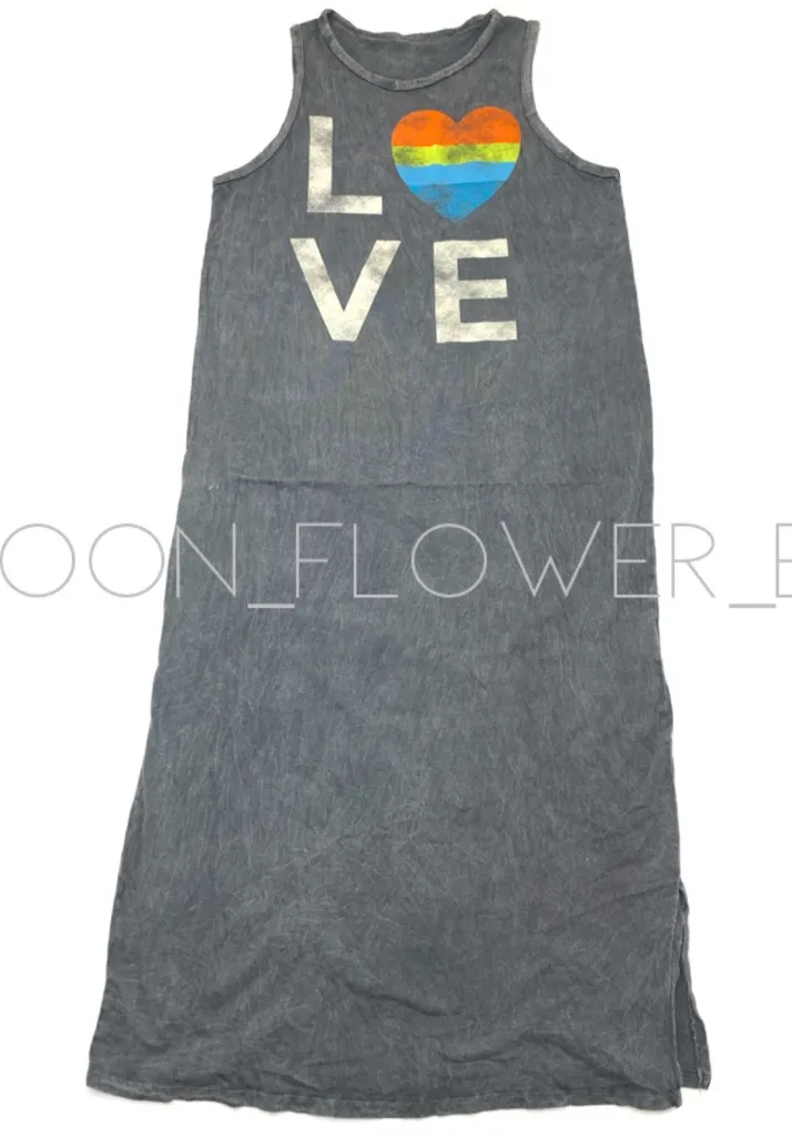 This Rainbow LOVE Tank Top Dress is the perfect addition to your wardrobe. Made from a soft and comfortable gray mineral wash fabric, this dress is both stylish and versatile. The distressed Rainbow LOVE graphic on the front adds a pop of color and personality to the dress. The tank top style and sleeveless design make it perfect for warmer weather, while the midi length and side slits at the hem add a touch of elegance. Made from 100% cotton, this dress is not only fashionable but also breathable and easy to care for. Whether you're heading to a casual brunch or a day out with friends, this Rainbow LOVE Tank Top Dress is the perfect choice. Pair it with sandals for a laid-back look or dress it up with heels for a more sophisticated style.