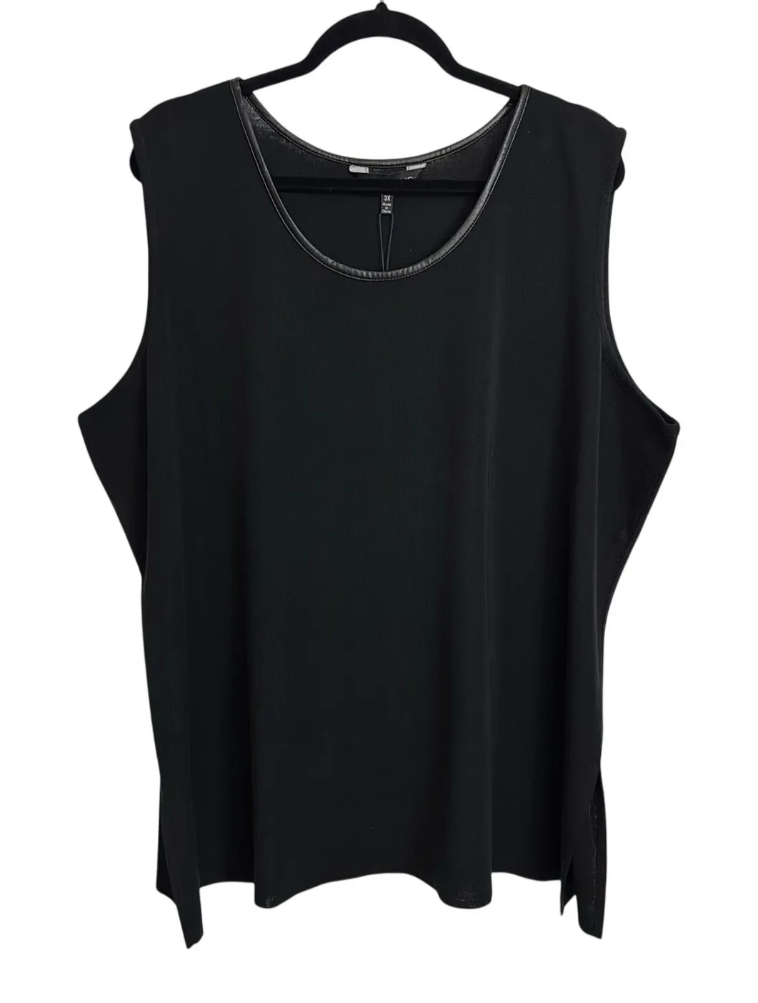Ming Wang Sleeveless Scoop Neck Knit Top in Black with faux leather trim neckline and side slits. Wrinkle-resistant, fade-resistant, and stretch-resistant knit construction (90% Acrylic / 10% Polyester). Machine washable pullover design with distinctive synthetic leather detailing around the scoop neck. Condition: New With Tags Bust (Armpit-to-Armpit): 26" Length (Shoulder-to-Hem): 29" Style: 331