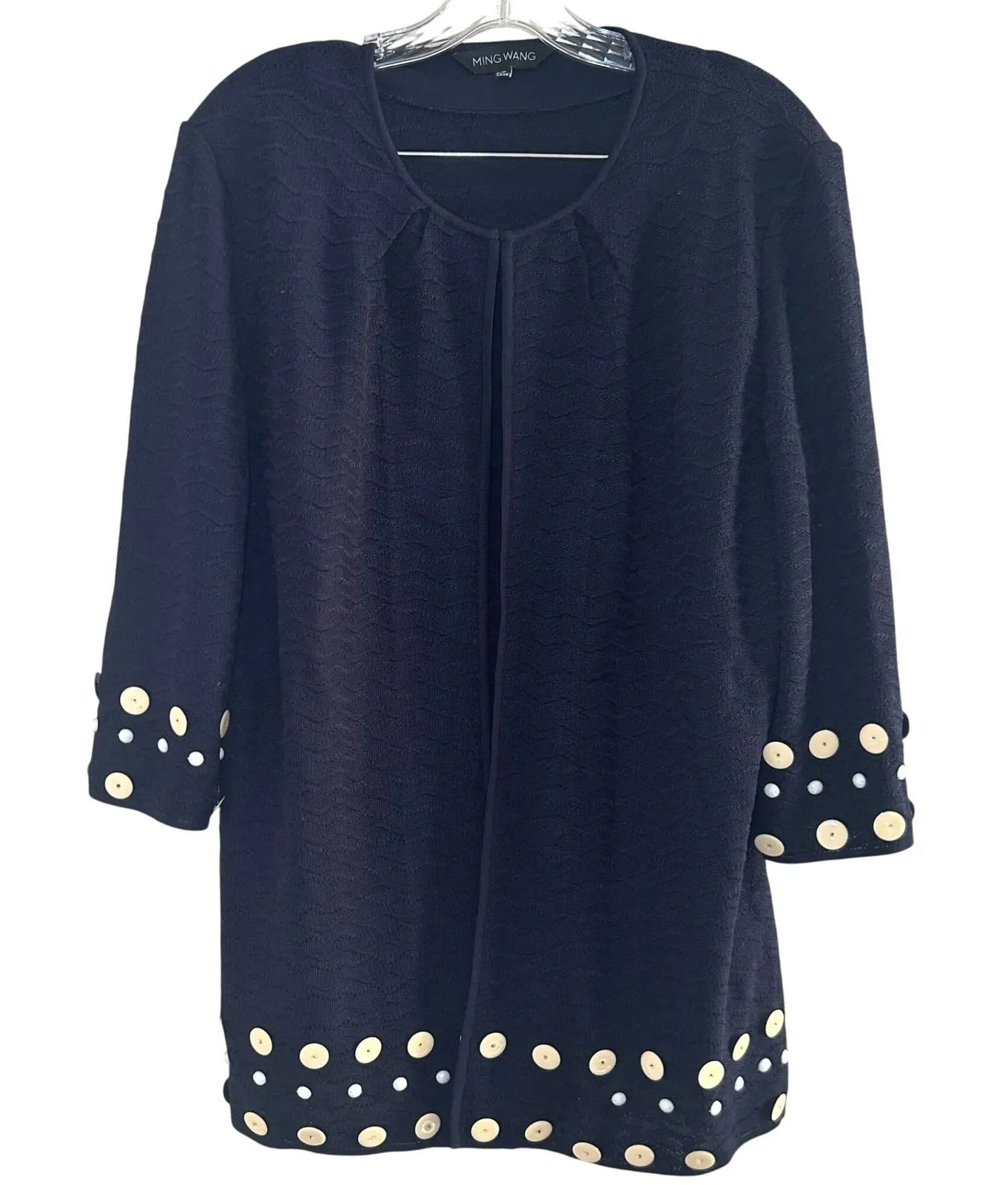 Some buttons missing, see photos for more details A stylish navy blue open-front cardigan sweater by Ming Wang. This piece features a textured wave-like knit throughout and is adorned with decorative cream and light blue buttons along the cuffs and hem. The unique embellishments add a touch of playful sophistication. Perfect for a casual outing or a sophisticated evening event. Style: Cardigan Department: Women Material: Acrylic Neckline: Round Neck Sleeve Length: 3/4 Sleeve Type: Sweater Features: Collarless, Lightweight Pattern: Geometric Sleeve Type: 3/4 Sleeve Fabric Type: Knit Accents: Button Knit Style: Open-Knit Season: Spring, Fall Fit: Classic Occasion: Casual, Workwear Keywords: Ming Wang sweater, navy cardigan, textured knit, button detail, open front, women's fashion, designer knitwear, statement sweater, elegant casual, evening wear, ladies clothing, unique embellishments