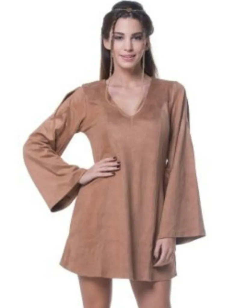 Mink Pink Tan Faux Suede Long Bell Sleeve Open Shoulder Mini Dress Size Medium Approximate flat l... Show more