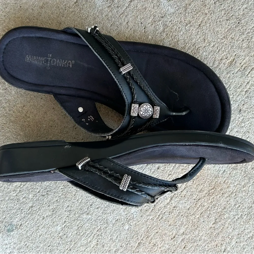 These sandals feature a sleek black design with silver decorative elements, offering a comfortable c... Show more