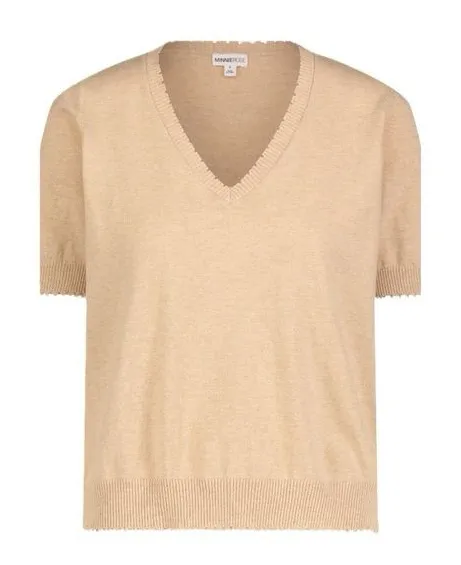 Features a flattering V-neckline with subtle raw-edge trim at the neckline, sleeves, and hem for an effortless, elevated look. Perfect for layering or wearing on its own year-round. Details: • Size: Women’s XS • Brand: Minnierose • Color: Tan / Camel • Short sleeves • V-neck • Raw-edge ribbed trim • Lightweight knit Fabric: • 95% cotton • 5% cashmere Condition: • Very good pre-owned condition