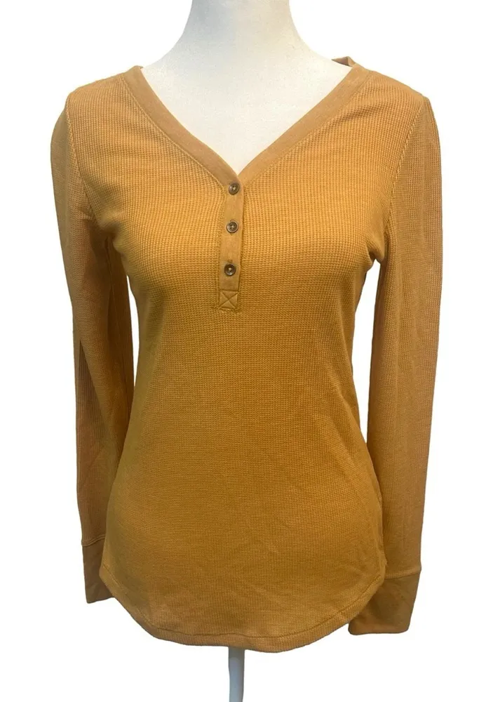 Vintage 90s Y2K Long Sleeve Mustard Yellow Waffle Knit Henley Top Size Medium Pullover. 3 Buttons. Machine Washable #ElenaGilbert #BellaSwan #Vamp #FairyGrunge #granolagirl #whimsigoth #everyday