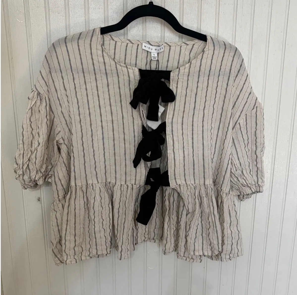 Type: Blouse Department: Women Style: Cropped Material: Linen Blend, Polyester Blend Neckline: Crew Neck Sleeve Length: Short Sleeve Sleeve Type: Casual Sleeve Pattern: Striped Accents: Bow Theme: Bohemian Features: Contrasting Trim Fit: Relaxed Fabric Type: Woven Occasion: Casual Closure: Lace Up Keywords: Miu Muse blouse, striped top, lace up detail, bow accent, peplum hem, women's fashion, casual chic, summer top, boho style, feminine blouse, relaxed fit, button front, linen blend