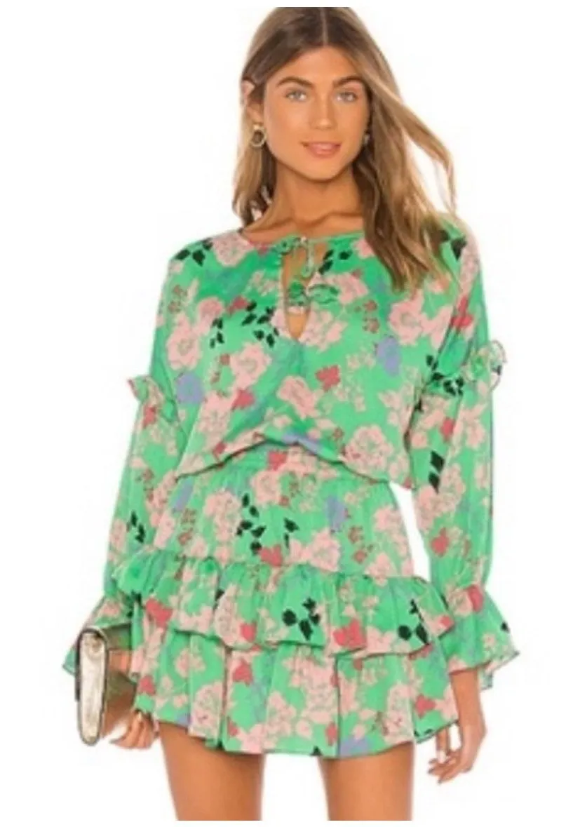 This MISA Los Angeles “Amalya” Mini Dress is a dreamy mix of boho charm and feminine flair. Designed in a vibrant green floral print with soft pink and purple tones, it features tiered ruffles, long sleeves with flared cuffs, and a tie-front keyhole neckline. The elastic waistband creates a flattering, comfortable fit. Details: • Brand: MISA Los Angeles • Style: Amalya Mini Dress • Size: XS • Color: Green floral (pink & purple accents) • Fabric: 100% Polyester • Made in: USA 🇺🇸 • Condition: Excellent — no flaws Approximate Measurements: • Waist: 12” flat, unstretched (elastic waistband stretches) • Length: 31.5” from shoulder to hem Perfect for resort vacations, brunch, spring weddings, festivals, or casual date nights — effortlessly chic, lightweight, and easy to wear. 🚚 Fast shipping | Smoke-free, pet-free home Keywords: MISA floral mini dress, green boho ruffle dress, tiered mini, long sleeve boho dress, resort wear, spring wedding guest, romantic vacation style