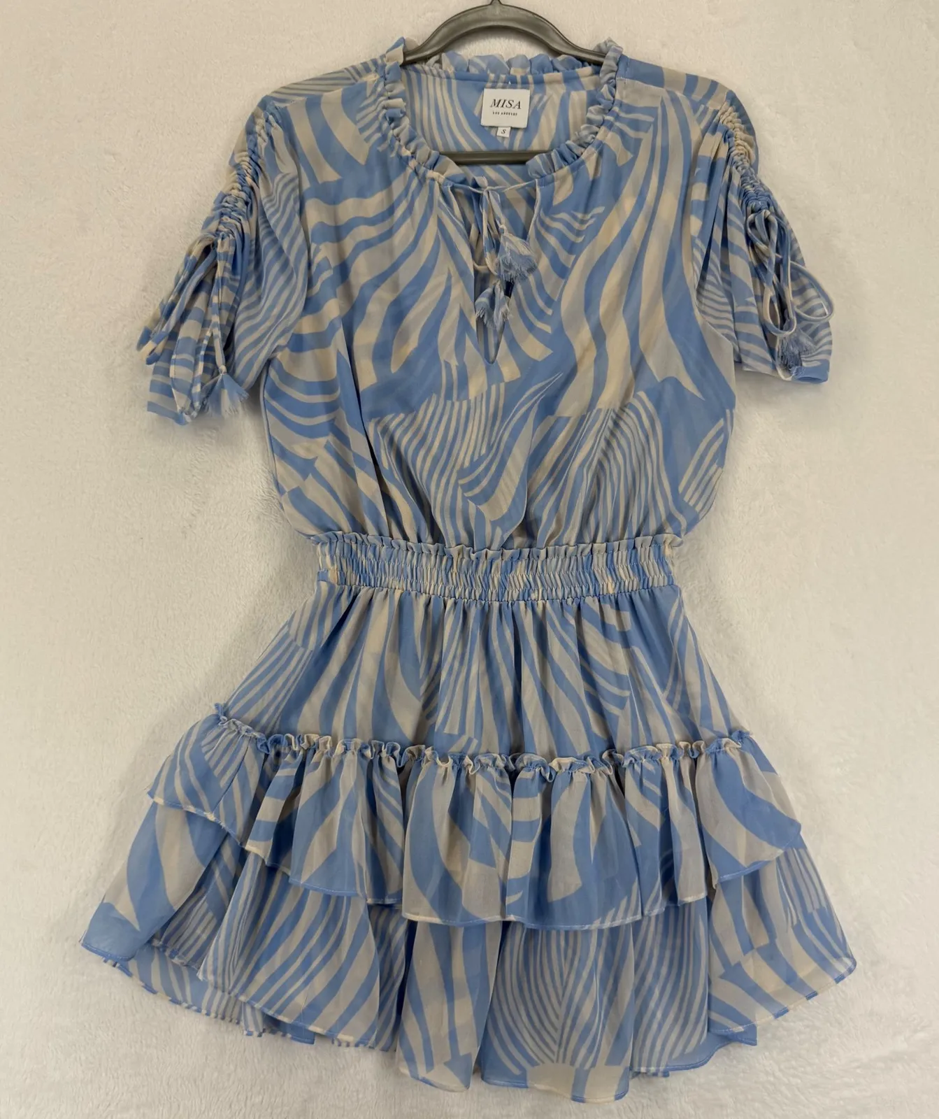Style: Mini, Sundress, A-Line Dress Length: Short Department: Women Sleeve Length: Short Sleeve Pattern: Animal Print Occasion: Casual, Party/Cocktail, Travel Material: Polyester Neckline: Round Neck Theme: Bohemian Fabric Type: Chiffon Season: Summer Sleeve Type: Puff Sleeve Closure: Tie Keywords: MISA Los Angeles, dress, women's dress, short sleeve, blue dress, beige dress, zebra print, size S, mini dress, boho dress, ruffle dress, summer dress, vacation dress, romantic, fairy, feminine, flowy, bohemian, babydoll, baby doll Thank you for viewing my listing! Please see the photos for a detailed look at its CONDITION and MEASUREMENTS. NOTE: there are a few small pulls which happen with this type of fabric, see pics. All preowned items have been steam cleaned and/or washed. Feel free to reach out with any questions.