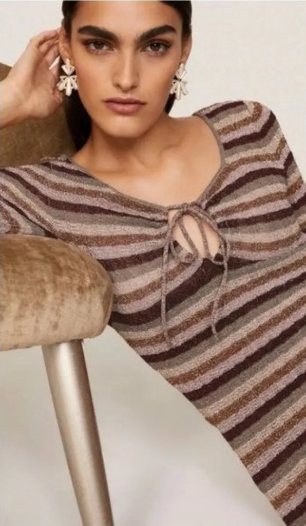 MISA Los Angeles Delfina Dress, size S. $272 excellent preowned condition - mended at back #0914P--9.1 - faux wrap skirt - metallic stripe - neckline tie + keyhole detail - approx 46.5" length