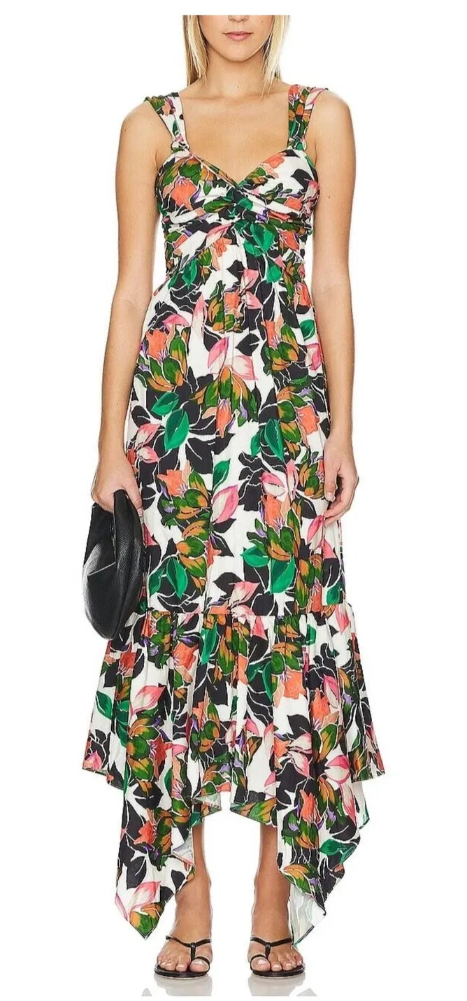 The new Esperanza dress is a head-turning silhouette cut from a gorgeous Las Palmas printed cotton poplin in a vibrant tropical palette that will take you from this season to the next. A flattering sweetheart neckline features a ruched bodice and wide ruched straps. A flattering squared back features a hidden back zip closure. This ankle-grazing mermaid silhouette is finished with a flounce hem. Pair with everything from flat sandals to strappy heels.  Made in the USA Dry Clean 98% Cotton 2% Spandex