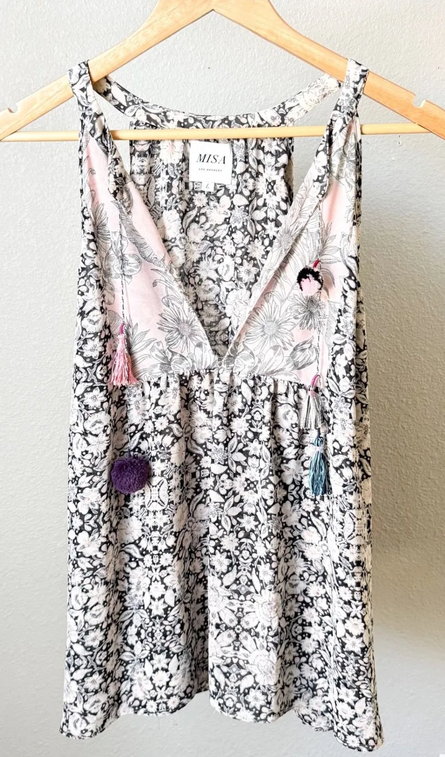 MISA Los Angeles floral print sleeveless top. This V-neck top features a flattering empire waist with gathering and playful tassel accents on the front. The intricate floral pattern is complemented by pink panels on the neckline. Sleeveless design with a racerback. Gently used in good condition Measurements: • Bust: 20 in • Length: 27 in Keywords: MISA, floral, sleeveless, vneck, tassels, boho, festival, summer, lightweight, womens, top, printed, pink, losangeles