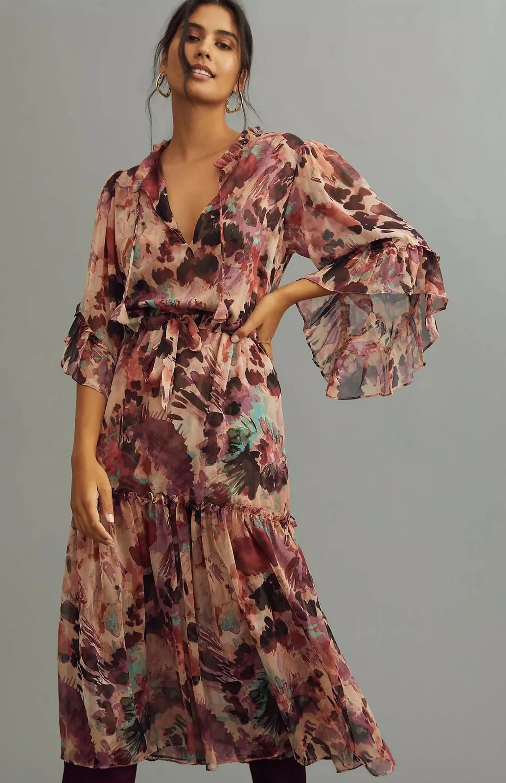 Misa Los Angeles Marcele Ruffled V-Neck Maxi Dress in Floral Dream - Size XS, great preloved condition! The Marcele is an effortlessly feminine midi silhouette cut in a floral watercolor crinkle chiffon. Featuring an adjustable tie-waist, semi-sheer ruffle sleeves and an open neckline with our signature string petal ties. - Made in the USA - Dry Clean - 100% Poly Chiffon 5415