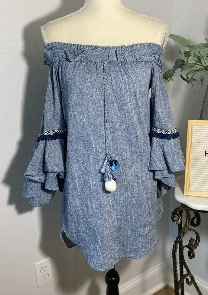 MISA Los Angeles Tent Dress Blue Fringe, Ruffle, Pom-Pom, Embroidered & Tassel Accents Three-Quarter Sleeve with Off-The-Shoulder EUC 100% Cotton Made in USA Flat Measurements: Pit to pit: 17 Length: 27 Sleeve: 19