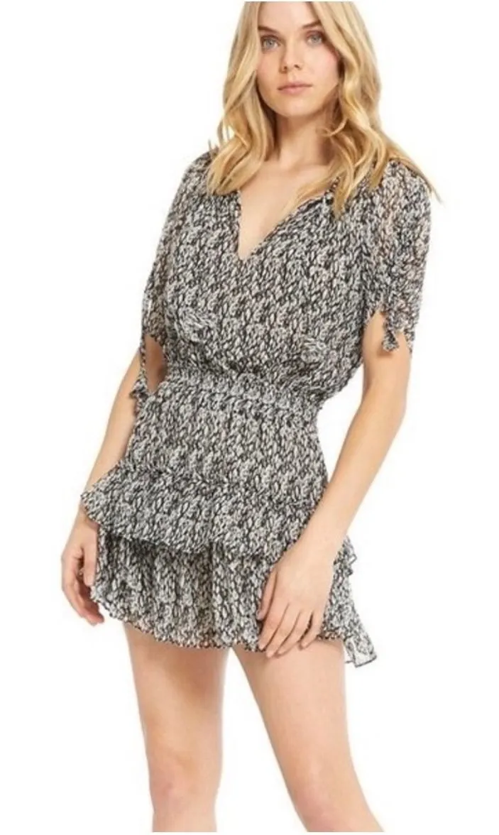 Size small Excellent condition Color: Black / White Snake - Chiffon fabric - Snake print - Split neckline with petal ties - Adjustable shirred sleeves - Elasticated waist - Tiered ruffle skirt - Partially lined - 100% Viscose - Made in USA - Style #: HADR7043 HA008 - Dry clean only