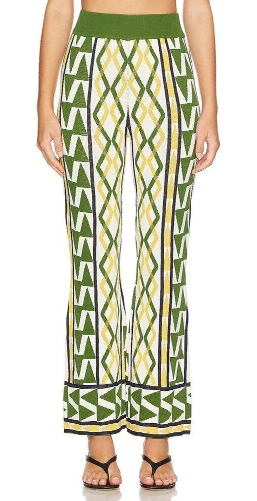 Rialta is a flattering stretch knit jacquard pant in our vibrant limoncello geo. This slightly flared fitted style features a ribbed knit waistband for a flattering fit. Pair with the coordinating Aida tube top and Batista cardigan for a getaway ready look. Pull-on styling with elastic waistband Midweight jacquard fabric 51 cm at the knee and 51 cm at the leg opening Dry clean only 73% viscose, 27% polyamide Made in China Color: Limoncello Geo MSRP: $235.00 Revolve Model Info Mila is 5'10" and is wearing a size S Waist 24.5 Bust 34 Hips 34.5 Product measurements Inseam 29.5" Rise 12.0" Knee Opening 20" Leg Opening 20" Size: Womens L Measurements taken flat across, stretchy Hips 20 in Waist 15 in Condition: New With Tags Tags: farfetch, night out, party, event, date night cocktail, going out, bright colorful, brunch, bachelorette, simone, rush, sorority, designer, luxury, high end, runway, revolve, anthropologie, boho, bohemian, sexy, mini, eyelet, cocktail, party, beach, vacay, vacation, summer, boho bohemina, hippie, 70s, mexico, resort, destination, bride, rehearsal dinner, retro