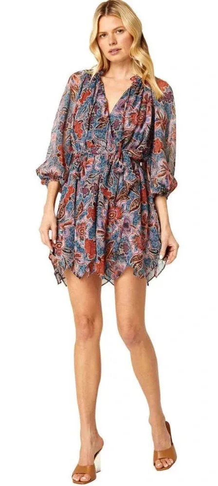 Brand new with tags MISA Los Angeles Tara Dress in Cerulean A new take on a faux wrap dress, Tara is a feminine silhouette handcrafted from a gorgeous floral chiffon with shimmering lurex. Featuring a double-lined v-neckline with pull-string ties and button enclosure, semi-sheer long blouson sleeves and a handkerchief skirt. This slipover style is finished off with a self-tie waist. Style this mini with sandals, slides or boots. 97% Polyester 3% Metallic Size XS Armpit to armpit is approx 23" Waist is approx 10" Hip is approx 24" Length is approx 35" Ready for a new home ♻️ Feel free to ask any questions! _____________ About Spin + Thrift *Accepting all reasonable offers. *We ship same or next business day. *Smoke free home. *Shop with confidence over 5500+ 5 star ratings, *New items added daily!