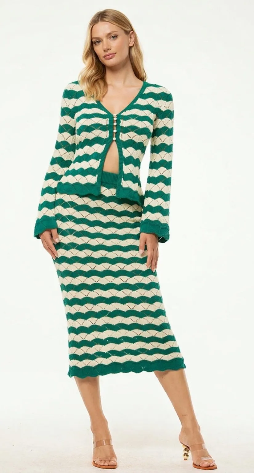 Chic chevron patterns embrace your silhouette in this MISA LOS ANGELES cardigan. Delicate open knitwork creates a unique textural appeal, while the vibrant green and cream stripes evoke a playful yet sophisticated vibe. The flattering V-neckline and button-front closure offer versatile styling options, and the bell sleeves add a touch of retro flair. Perfect for layering over a camisole for a garden party or adding a stylish touch to your everyday denim ensemble. B4 Style: Cardigan Department: Women Neckline: V-Neck Sleeve Length: Long Sleeve Type: Sweater Features: Lightweight, Breathable, All Seasons Pattern: Geometric Sleeve Type: Flared Sleeve Fabric Type: Knit Accents: Button, Crochet Knit Style: Open-Knit Season: Spring, Fall Fit: Classic Occasion: Casual Unit Type: Unit Keywords: MISA Los Angeles, chevron knit, open knit, bell sleeves, button front, V-neck, designer knitwear, statement sweater, resortwear, bohemian, chic, fashionable, lightweight knit