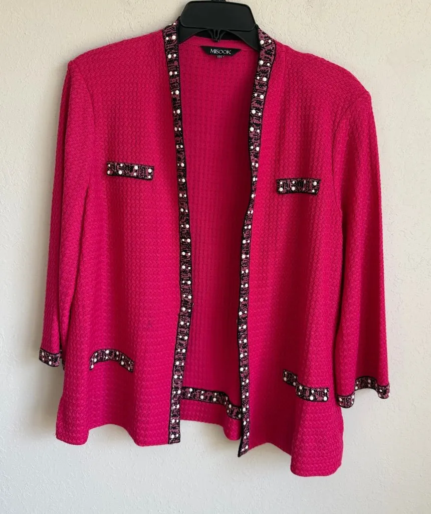 Misook Kiss-Front Hot Pink Knit Black Pearl Trim 3/4 Sleeve Blazer Jacket Womens L Good condition,... Show more