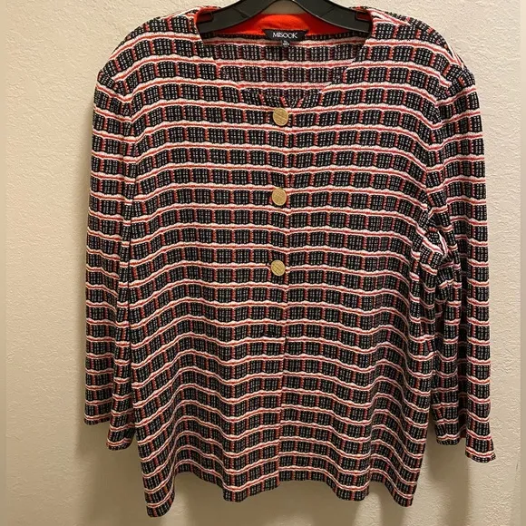 In great condition but it is missing the last button (see last photo) 3/4 length sleeves Gold-toned buttons Shoulder pads Armpit to armpit: 24" Length from shoulder to bottom hem: 26" 66% Acrylic 17% Nylon 17% polyester