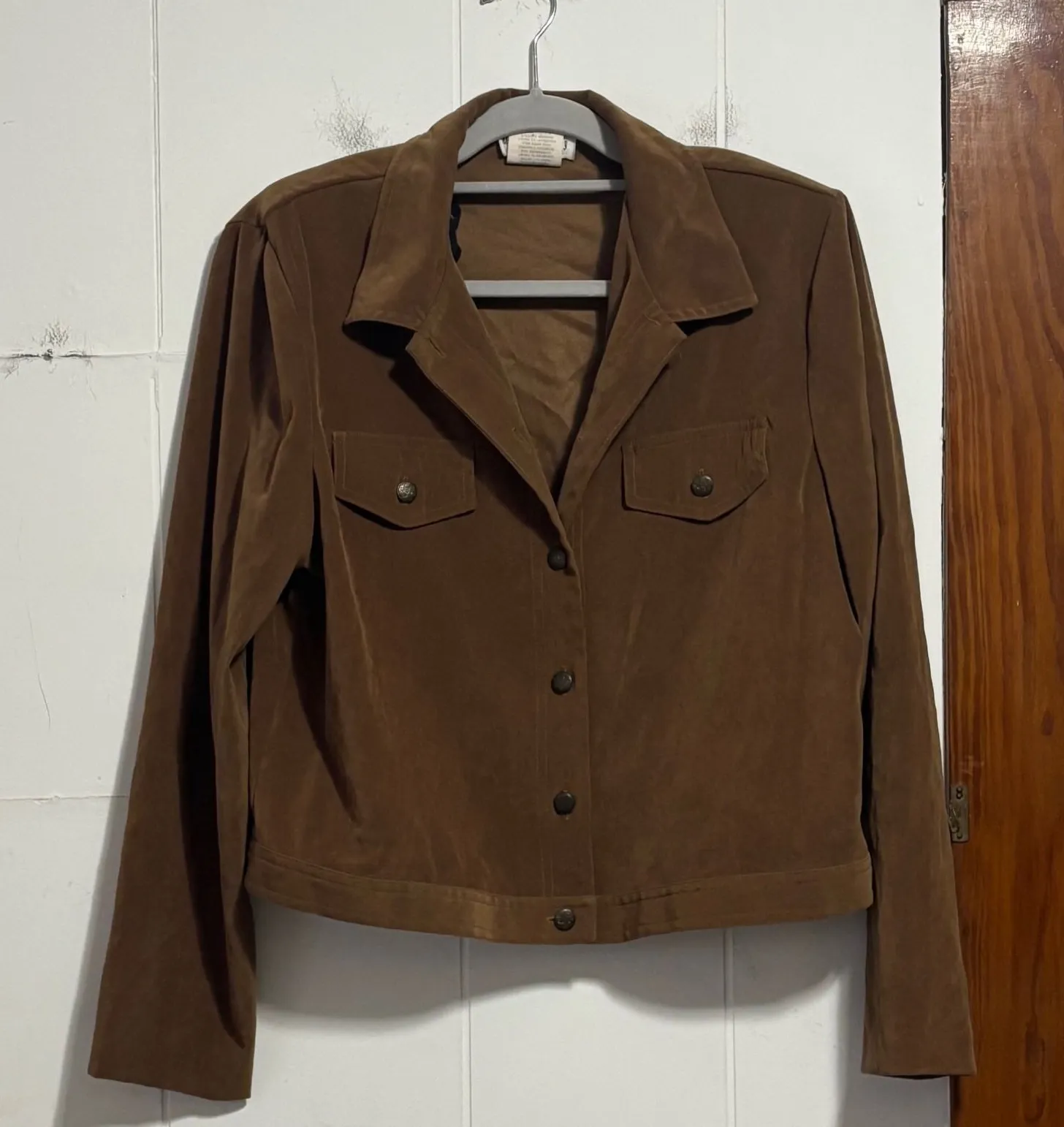 Women's brown button-front blazer jacket from Miss Dorby. This stylish jacket features a classic collar, two front flap pockets with decorative button closures, and long sleeves. The rich brown color and polished design make it a versatile addition to any wardrobe. Perfect for a business casual office or a sophisticated evening out. Type: Jacket Outer Shell Material: Polyester Style: Basic Jacket Department: Women Lining Material: Acetate Accents: Button Features: Collared, Lined Fabric Type: Rayon Pattern: Solid Closure: Button, Snap Occasion: Casual, Workwear Sleeve Length: Long Sleeve Fit: Regular Garment Care: Machine Washable Unit Type: Unit Keywords: blazer, jacket, button-up, long sleeve, workwear, business casual, tailored, smart casual, classic, versatile, outerwear, sophisticated, professional