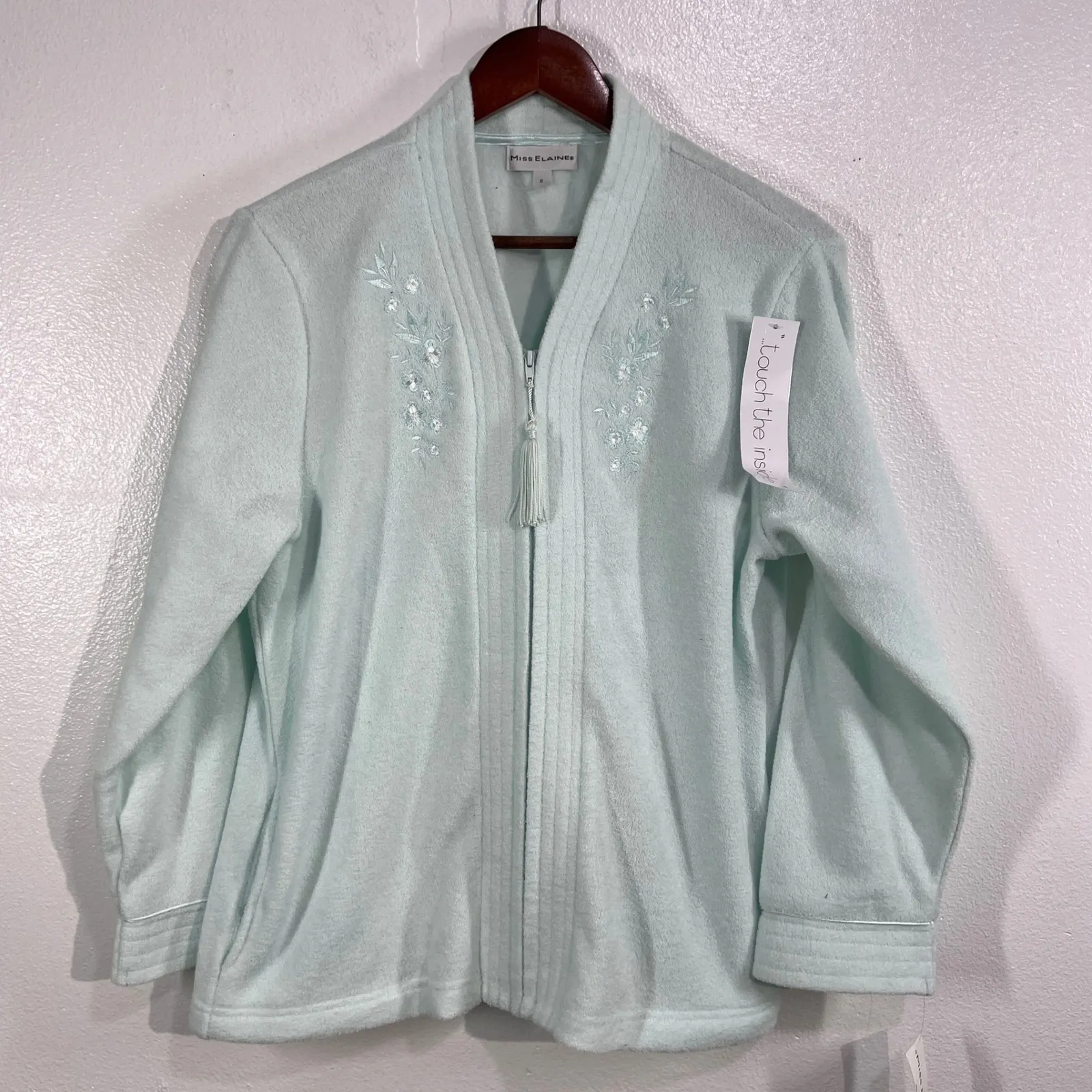 Measurements: • Pit to pit: 21 inches • Length: 24 inches Details: Brand: Miss Elaine Size: Small Color: Aqua Blue Material: 100% Polyester Features: Embroidered floral detail, zip front with tassel pull, soft fleece texture, long sleeves Condition: New with Tags (NWT) Miss Elaine | Fleece Robe | Zip Front | Embroidered | Floral | Aqua Blue | Small | Lounge | Sleepwear | Pajamas | Cozy | Vintage Inspired | Tassel Pull | Soft I ship out items Monday-Friday. • All items come from a pet-free, smoke-free home. • Please compare the measurements to something you already own. Thank you for visiting my store.