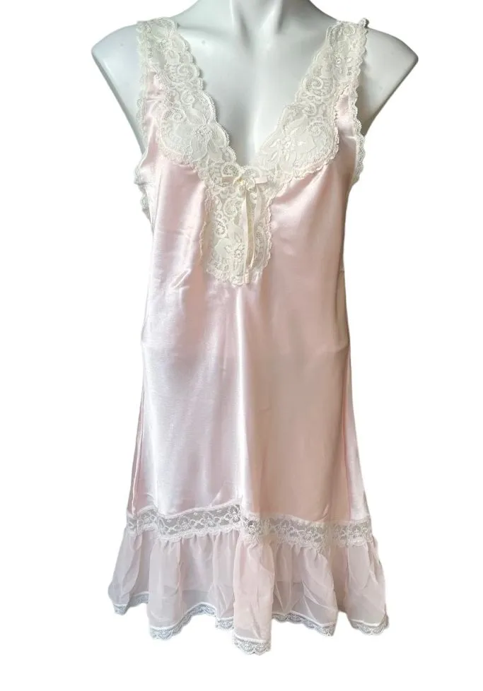 Miss Elaine Vintage (Union Made) Nightgown. Lace trim and a wide lace border hem. 100% polyester. Pink/Cream. Great condition. The center now accent has some glue that shows slightly through the lace (this was originally made like this) Size: XS Approx measurements: Armpit to armpit: 17.5” Length: 34.5” front, 36.5” back