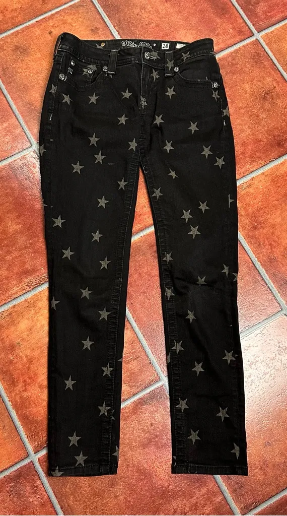 The ultimate flattering skinny jeans by Miss Me, these feature an all over star graphic of varying f sizes and neutral color tones. Signature rise. Brand: Miss Me Condition: Excellent Style: Skinny Size: 28 Inseam: 31”