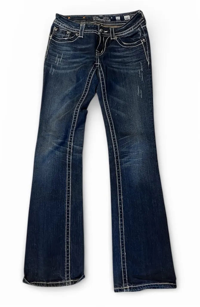 Classic Miss Me bootcut jeans featuring signature jeweled back pockets ✨ Flattering fit with a dark... Show more