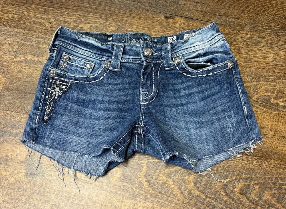 Miss Me Cut-Off Blue Denim Jean Shorts Womens Size 26 Low Rise Flap Pockets Rhinestone Bling Y... Show more