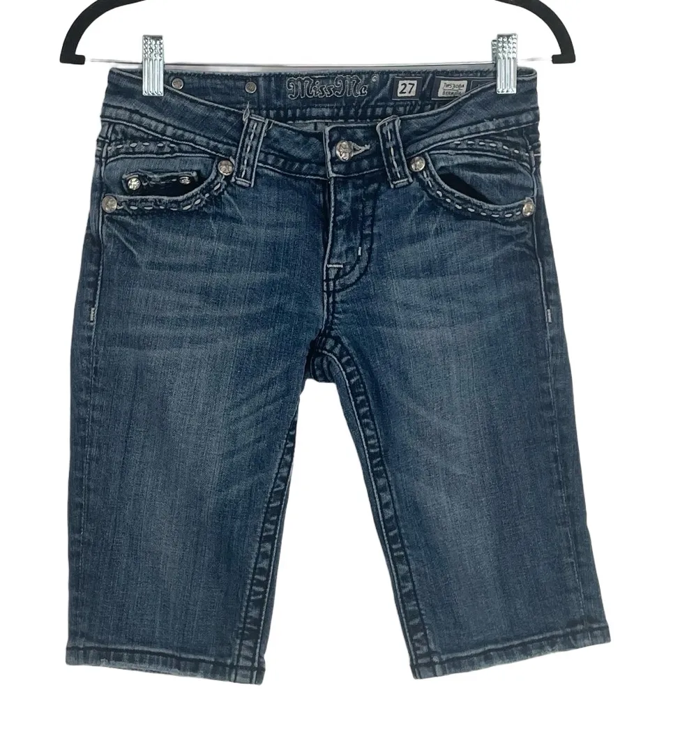 Miss Me Women's Blue Distressed Embroidered Mid Rise Bermuda Denim Shorts Size 27