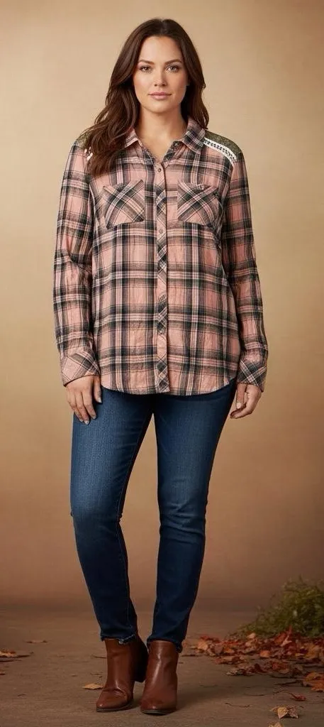 Condition: No rips or stains The Miss Me Women's Plaid Button Up Shirt in Pink with Lace Back is a... Show more