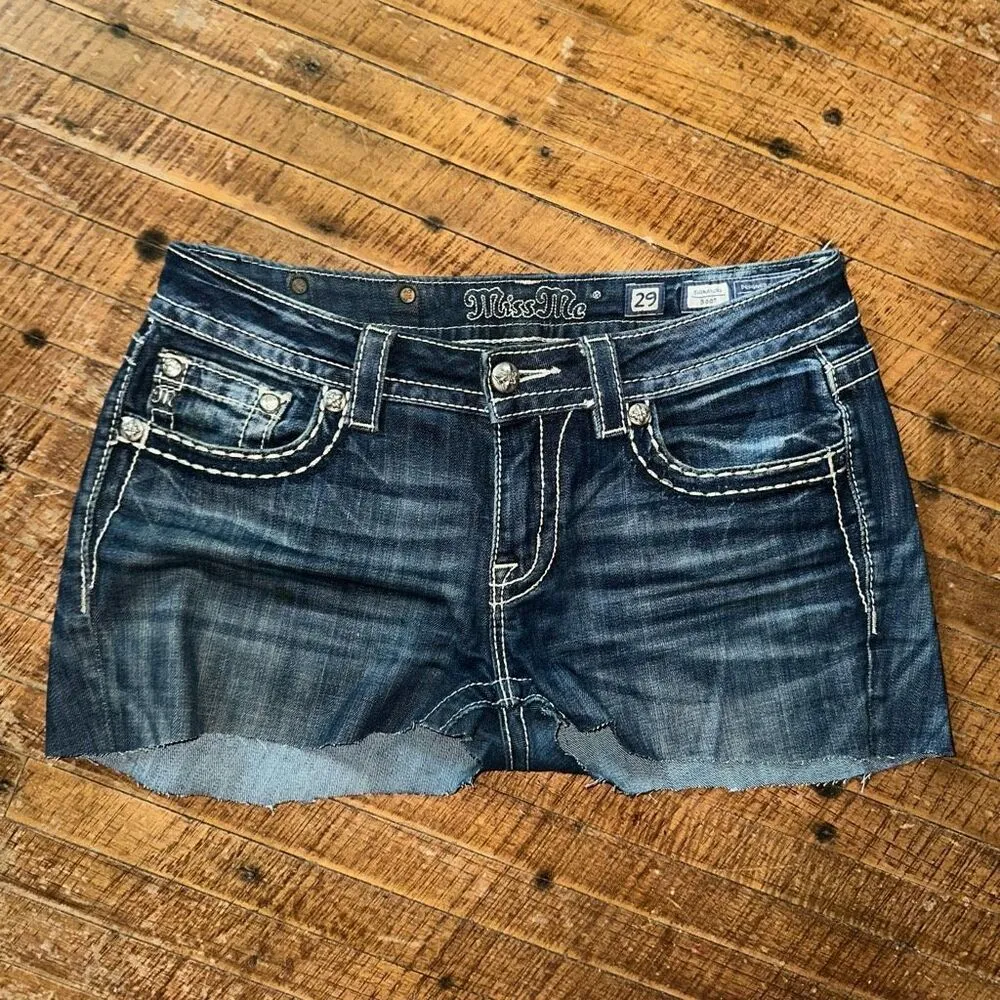 Miss Me distressed, denim, bling, western, cowboycore, festival, cutoff shortie shorts. Size 29. Pai... Show more