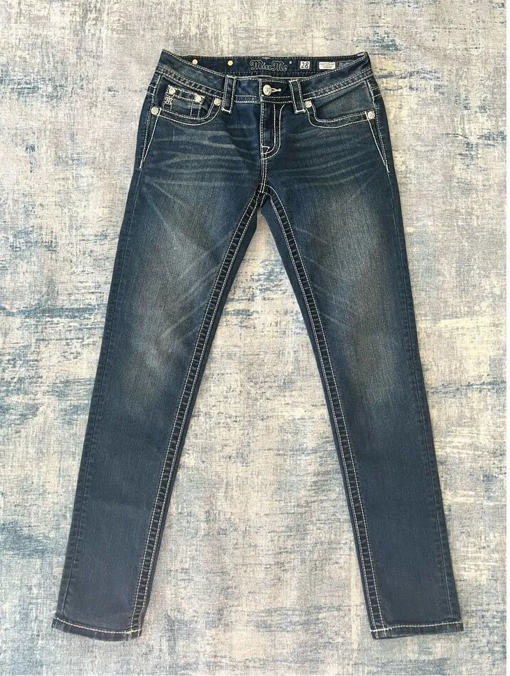 Miss Me Jeans’ famous denim shorts and skinny, bootcut, and straight-leg jeans are instantly recognizable thanks to their iconic white stitching, decorative pockets, rhinestone embellishments, and crystal buttons.
