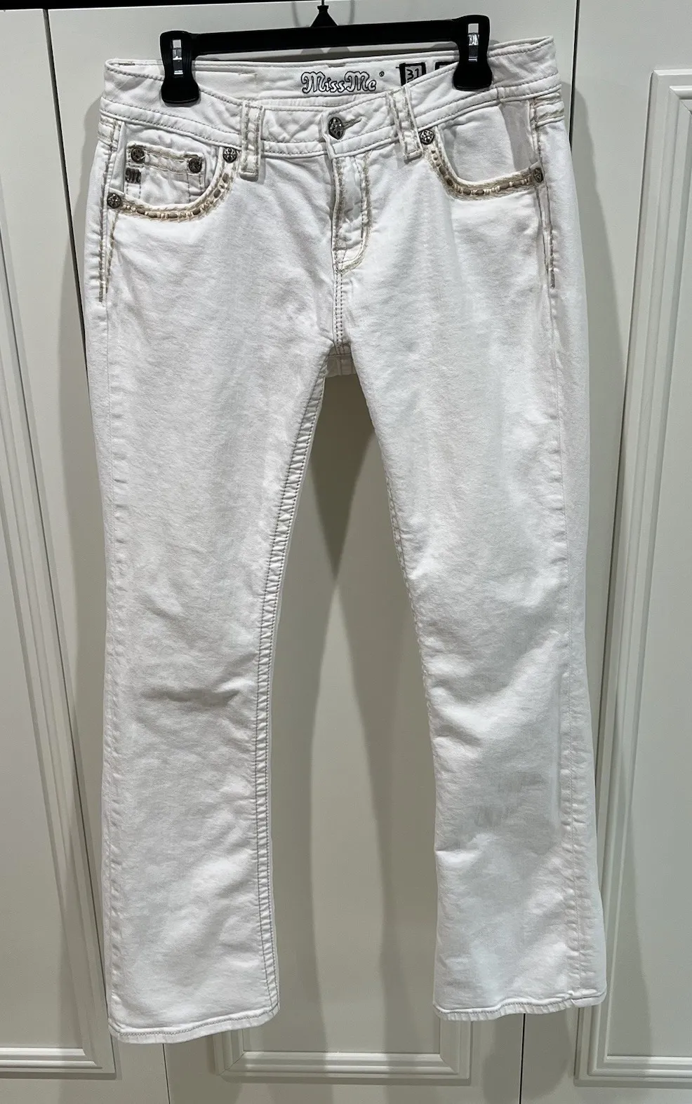 Miss Me Jeans’ famous denim shorts and skinny, bootcut, and straight-leg jeans are instantly recognizable thanks to their iconic white stitching, decorative pockets, rhinestone embellishments, and crystal buttons.