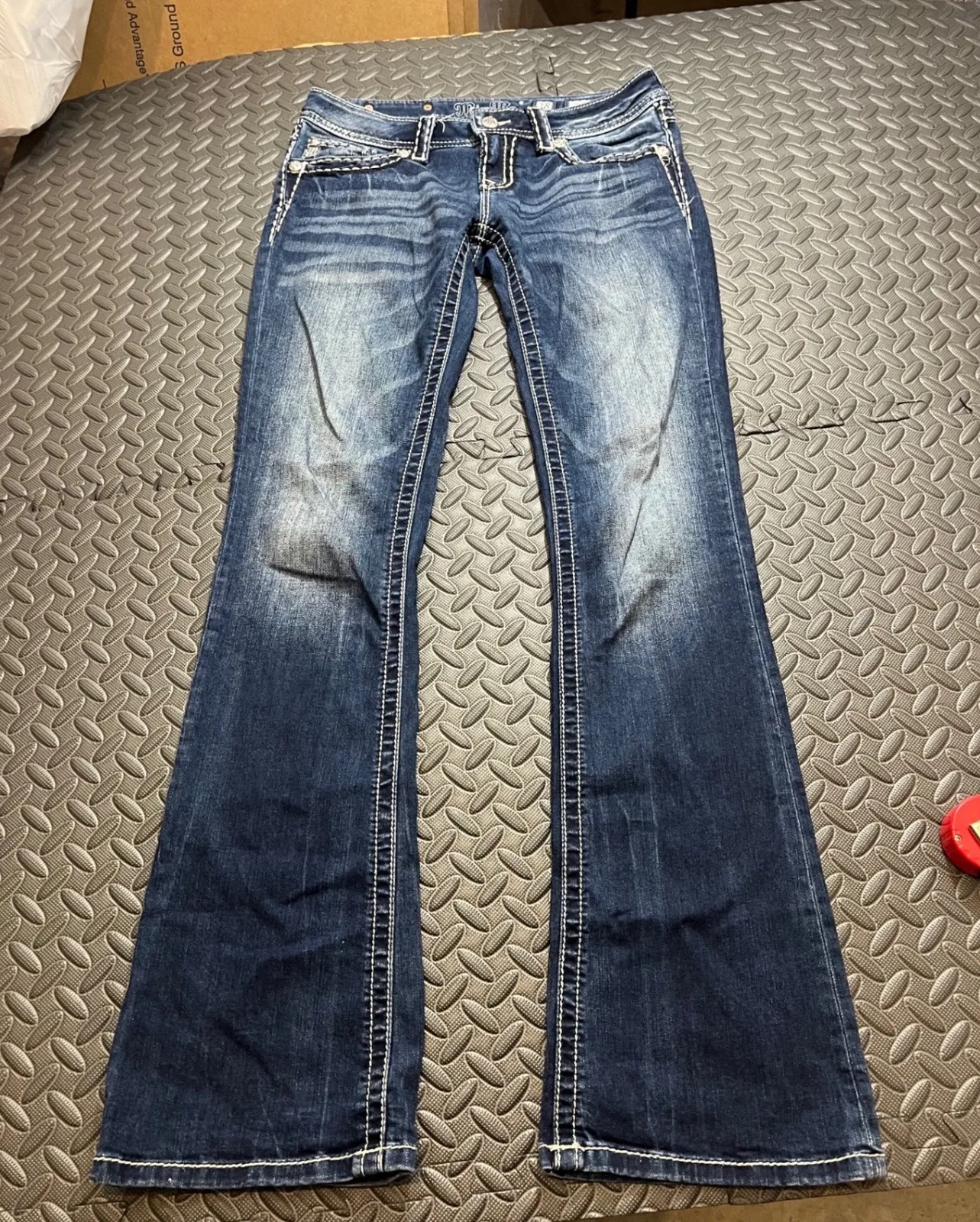 Miss Me Jeans’ famous denim shorts and skinny, bootcut, and straight-leg jeans are instantly recognizable thanks to their iconic white stitching, decorative pockets, rhinestone embellishments, and crystal buttons.