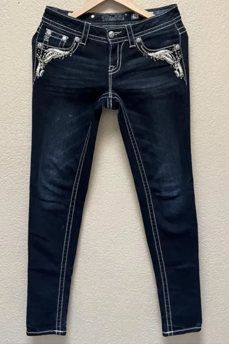 Miss Me Jeans’ famous denim shorts and skinny, bootcut, and straight-leg jeans are instantly recognizable thanks to their iconic white stitching, decorative pockets, rhinestone embellishments, and crystal buttons.