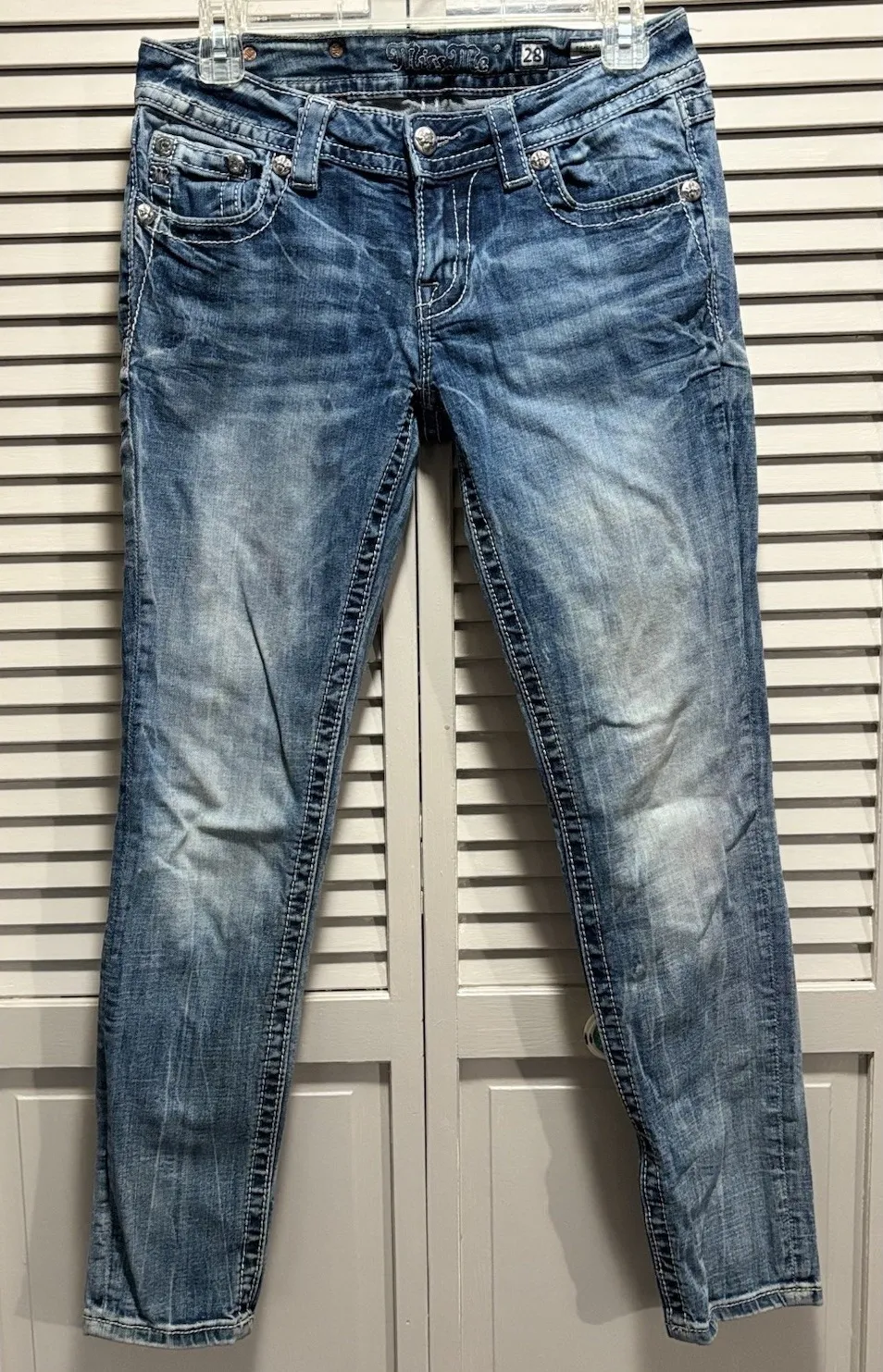 Miss Me Jeans’ famous denim shorts and skinny, bootcut, and straight-leg jeans are instantly recognizable thanks to their iconic white stitching, decorative pockets, rhinestone embellishments, and crystal buttons.