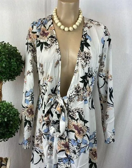 Miss Ord White Floral Long Sleeve Tie Front Kimono Robe Swimsuit Coverup L Size L - $35 - From Designer