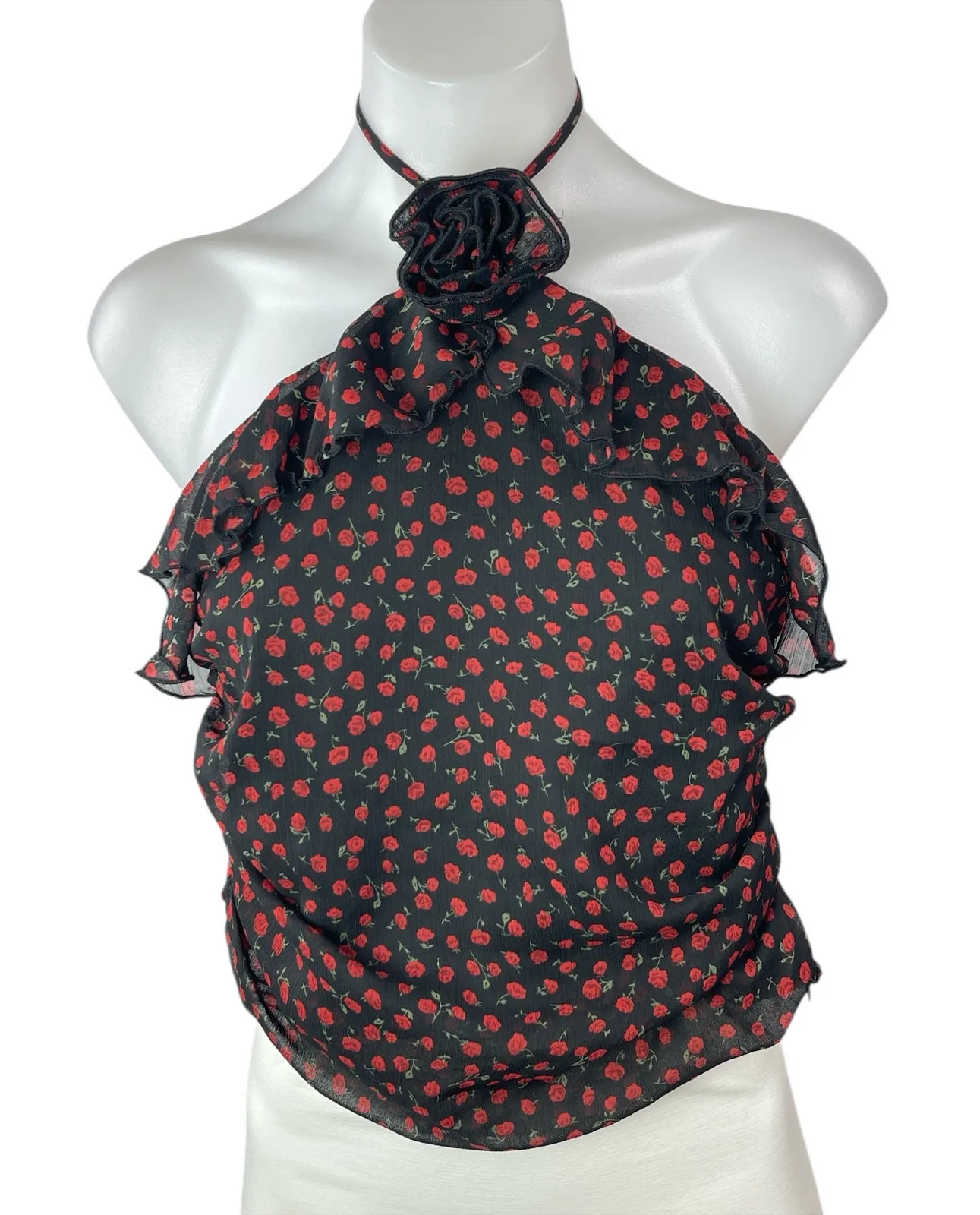 Miss Selfridge Black Floral Rose Halter Ruffle Sleeveless Blouse Top Size 6 Size: 6 Condition: Like New Chest: 32” Length: 14” *Measurements are taken lying flat. We double the flat lay measurements of the chest. ** If displayed on a mannequin, the size is small; if on a plus-size mannequin, the size is extra large.