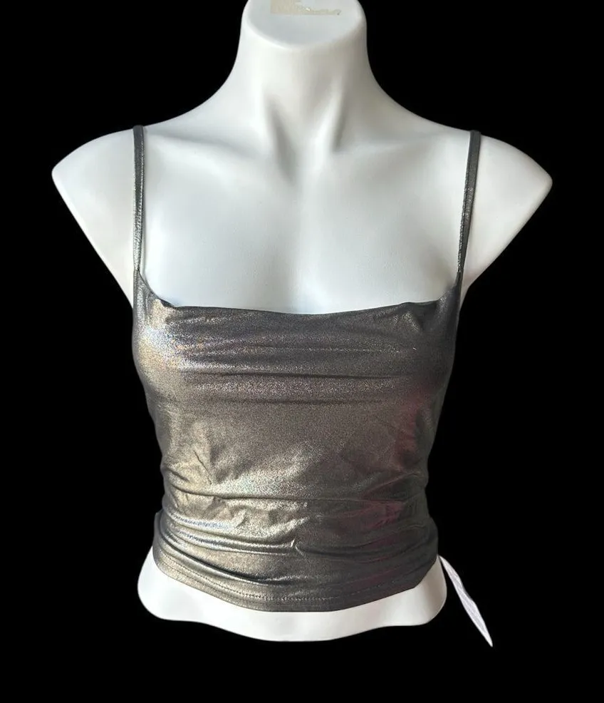 P2 Details ****SOLD OUT ONLINE Sexy metallic cowl cami is perfect for a night out with the girls or date night!! Pit to Pit measurement approximately 15” Length back to hem approximately 9” NWT IN PACKAGE FAST SHIPPING