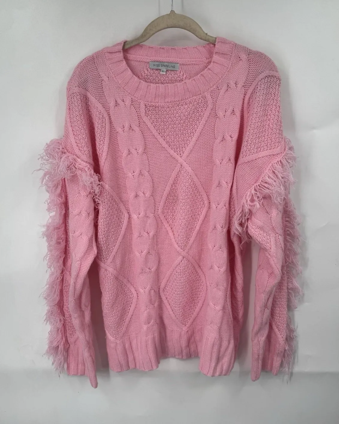 Great pre owned condition. Fringe detail. Cable knit. Size large. All measurements are approximate: 25 inches pit to pit. 22 inch sleeve from cuff to pit. 29 inch length from shoulder to bottom hem.