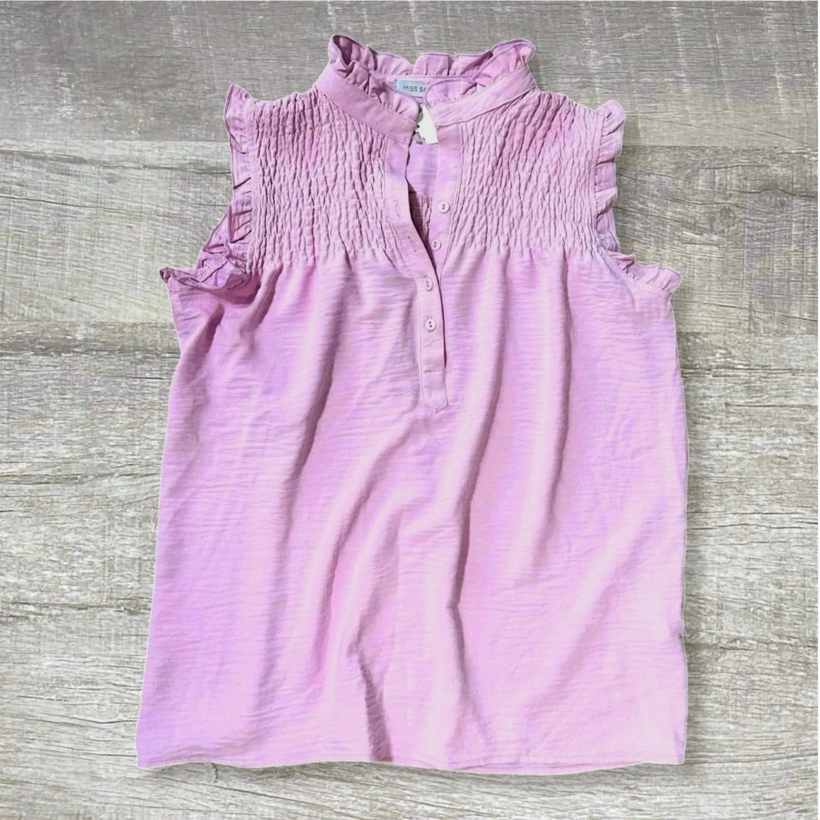 Boutique Womens Casual Relaxed Fit Frill Trim Smocked Shirt 95% Polyester / 5% Spandex Stand Up Collar Ruffle & Frills Button Smocked Hand Wash Suggested Size: Womens Small Approximate Measurements Lying Flat: Bust 21” Length 25” Condition: New with tags still attached. 1038-07-02