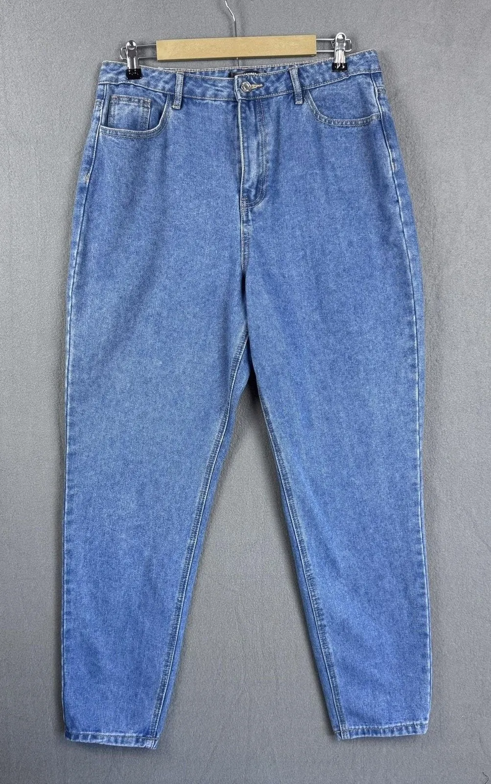 Brand: Missguided Item: Womens high-rise tapered leg denim jeans in a classic medium blue wash. Material: 100% cotton denim; Made in China. Size on tag: US 10R (UK 14R / EUR 42R). Style/Model codes: ART NO 10163551; STYLE NO G1807056. Details: Five-pocket design, zip fly with button closure, belt loops, tapered leg, logo back patch, Missguided branded hardware.