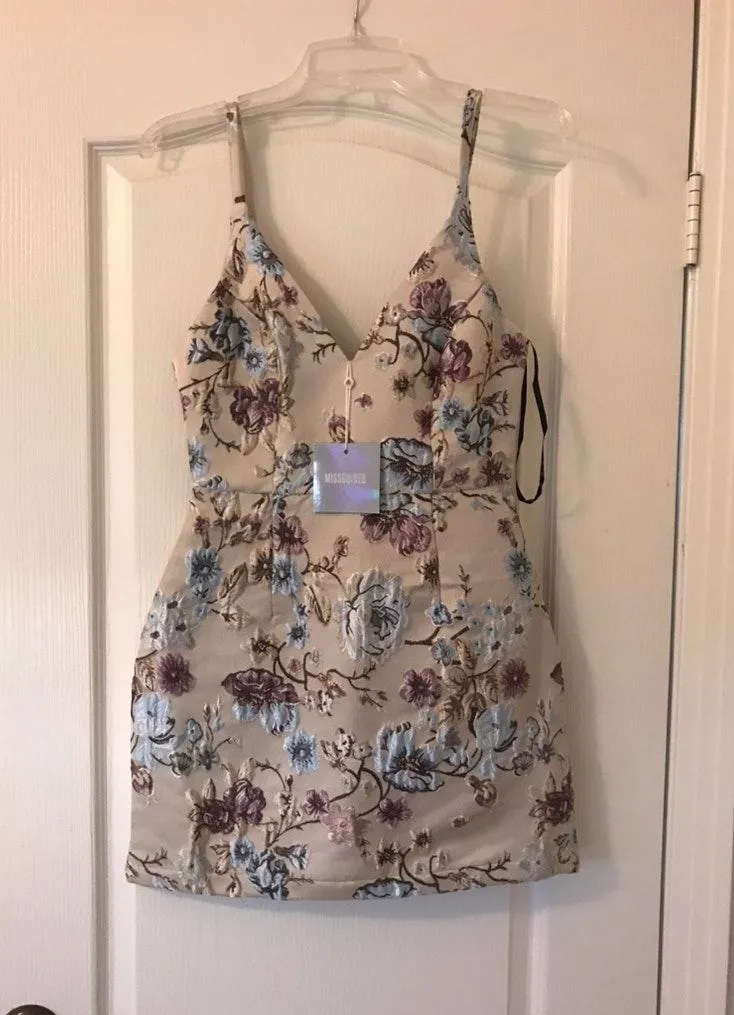 Floral pattern misguided mini dress. Bought it for a party in London (which is why it is in Uk sizes) and never wore it. Comes with tags and it says size 4 US but it runs right and the material doesn’t stretch. So I would say more like a 0/2 size.