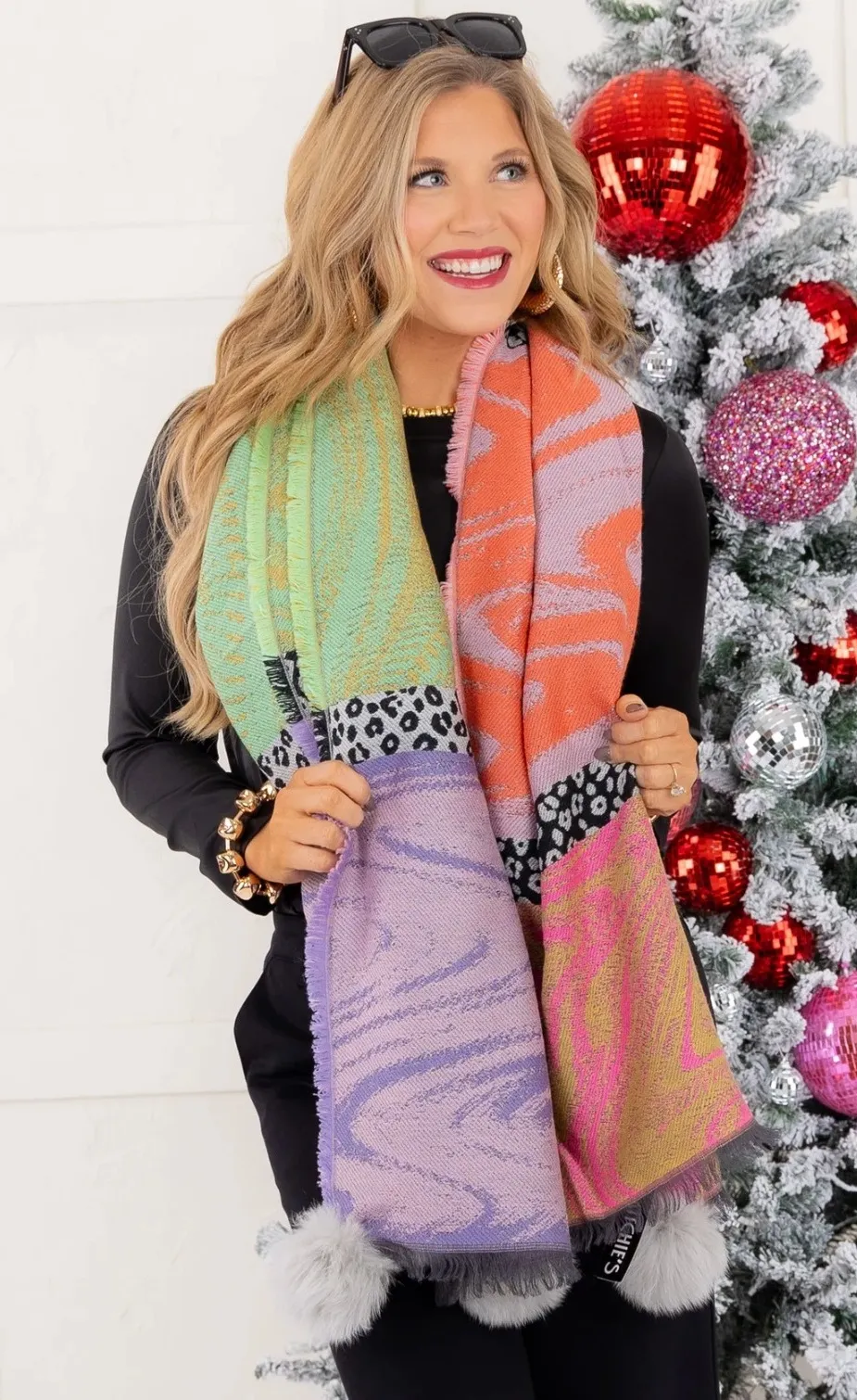 Brand: Mitchie's Style Name: Wild Side Cloud 9 Scarf Size: Length 72" Width 29" Color: Multicolor (pink, green, orange, lavender with animal & swirl motifs) Material: 65% acrylic, 30% cotton, 15% wool Condition: New With Tags Features: Bold multicolor animal and swirl pattern Soft woven fabric with lightweight warmth Faux fur pom-pom corner accents Fringe edging Reversible look with contrasting panels Statement accessory design The Mitchie's Wild Side Cloud 9 scarf is a bold statement accessory featuring vibrant multicolor patterns and playful faux fur pom accents. Soft, lightweight, and eye-catching, it's perfect for elevating cold-weather outfits or adding personality to simple looks. Brand new with tags. I ship in 1-2 Business Days! statement scarf, multicolor scarf, animal print scarf, oversized wrap, bold accessories, colorful winter scarf, fashion forward style, faux fur pom scarf, eclectic fashion, boho chic accessory, artsy scarf style, cold weather accessory, vibrant pattern scarf, layered outfit accent, unique fashion piece, eye catching scarf, cozy winter wrap, playful accessories, modern bohemian style, expressive fashion, trendy scarf look, colorful wardrobe accent, elevated casual style, fashion gift idea, standout winter accessory