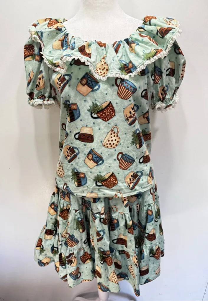 Vintage 80s 90s Handmade Skirt and shirt set. Whimsical teacup and polka dot print. Tiered, knee len... Show more