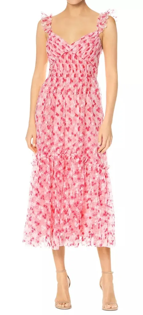 . In great condition! Tonal floral embroidery embellishes this feminine tiered midi dress. V-neck Flutter shoulder straps Concealed back zip Pleated bodice Tiered skirt with ruffle Fits true to size, order your normal size • Fitted through bust and waist; more relaxed fit through hips • Non-stretch fabric • Designed to hit at mid calf Sweetheart neckline Sleeveless, ruffled shoulder straps Shirred seamed front bodice Wide ruffle hem Allover floral-embroidered mesh fabric Lined Imported 100% polyester Dry clean