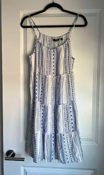 Mile Gabrielle's charming tiered sundress is perfect for warm-weather adventures. This sleeveless dress features a delightful blue and white print, adding a touch of bohemian flair to your wardrobe. The tiered design creates a flattering silhouette, while the lightweight fabric ensures all-day comfort. It's ideal for a casual brunch with friends, a summer picnic, or a relaxing day at the beach. Pre-loved and in good condition. Approximate measurements laid flat Pit to pit 20" Pit to hem 27" Keywords: tiered dress, sundress, summer dress, casual dress, sleeveless dress, blue and white dress, bohemian dress, beach dress, vacation dress, A New Day dress, women's dress, size L