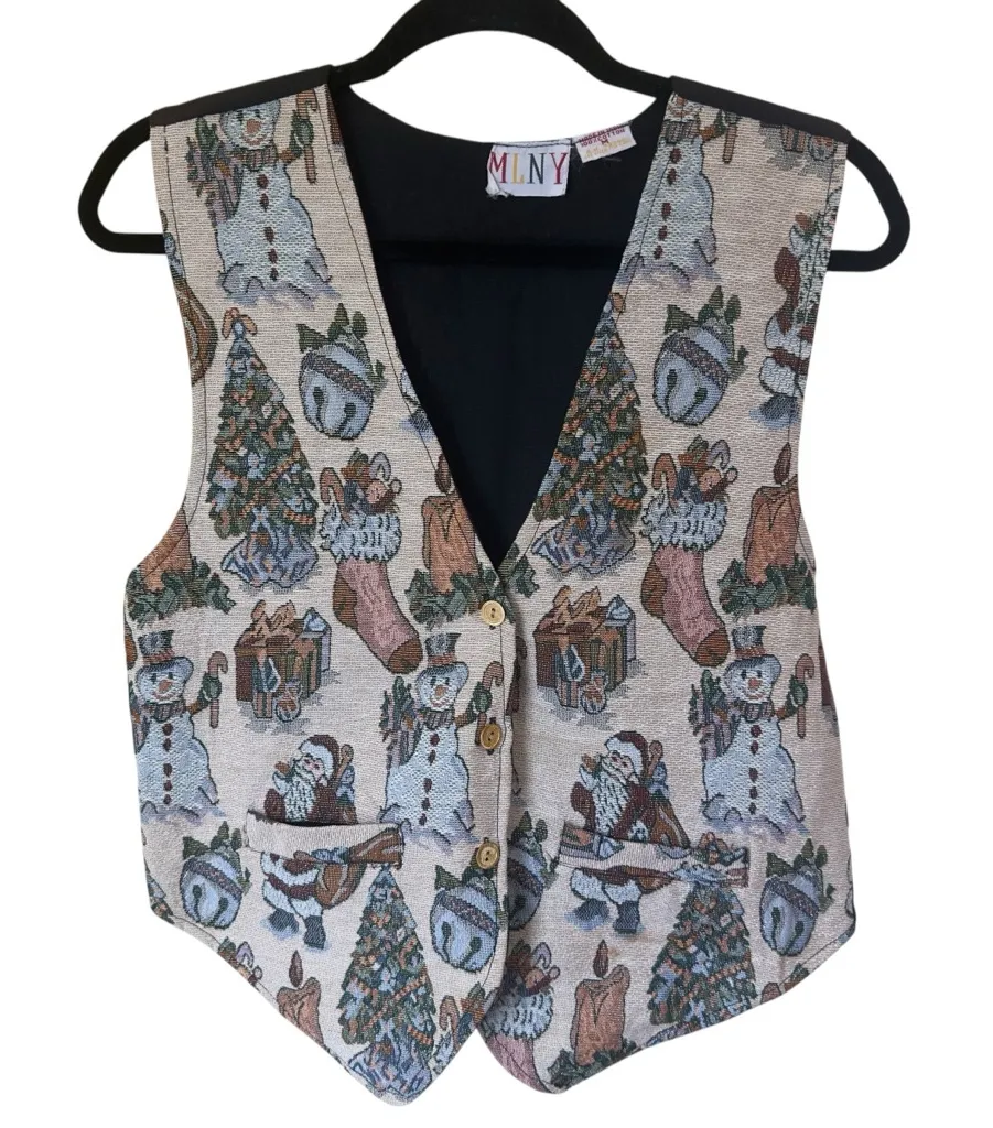 Brand: MLNY Size: Medium Color: Beige multicolor festive print Condition: Great preowned condition, no noted flaws Material tag: 100% Cotton Sold as is, smoke free home. Style Tags: vintage, christmas, holiday, santa, snowman, tapestry, festive, ugly sweater party, winter, novelty vest, 90s style, retro, holiday outfit, quirky, statement piece