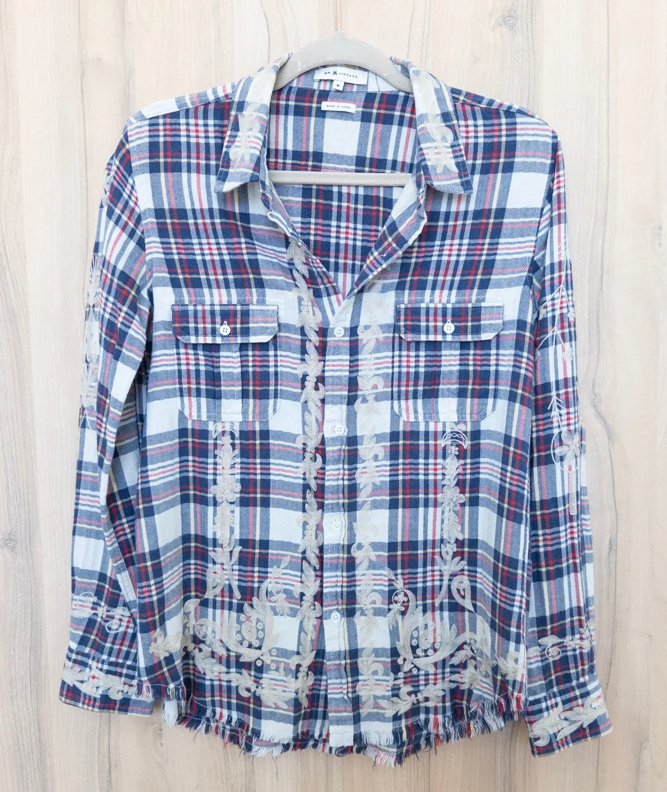 Features: • Soft plaid woven fabric with embroidered floral overlay • Button front with dual chest pockets • Raw fringe hem for a distressed look • Long sleeves with button cuffs • Relaxed fit — great layered or worn alone Boho, Western, Rustic, Grunge, Cottagecore, Indie, Festival, Artsy Excellent condition. No visible flaws. See all photos for details. Approximate measurements, flat lay: Length: 27" Pit to Pit: 20" Ships next business day. Bundle deals available. Smoke-free home. Please check measurements before purchasing. SKU 3653